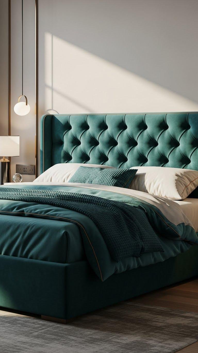 A padded headboard anchors the room visually and physically, giving your layered turquoise bedding a defined backdrop that elevates the whole scheme. Choose velvet upholstery with button tufting for luxe texture and confident form.