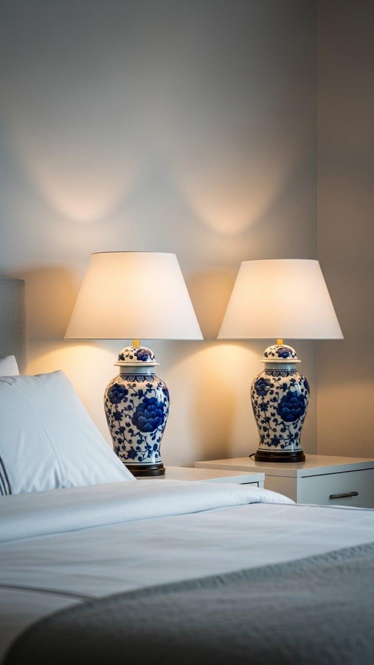 Blue-and-white porcelain lamps strike a timeless note, grounding a room with graphic pattern and refined color while keeping the overall scheme crisp and collected. You’ll choose pieces with confident porcelain glazing and crisp cobalt motifs to anchor bedside tables, balancing bold pattern with streamlined bedding. Place lamps symmetrically or mix heights for freedom in design while maintaining a polished, composed bedroom aesthetic.