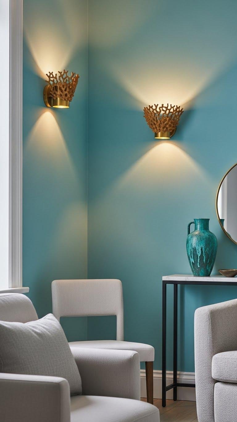 Pairing coral-inspired sconces with gold fixtures amplifies the coastal warmth while sharpening turquoise accents into a more sophisticated palette. You’ll choose antique brass or warmer gold tones to lift an aqua palette, balancing bold color with minimalist hardware.
