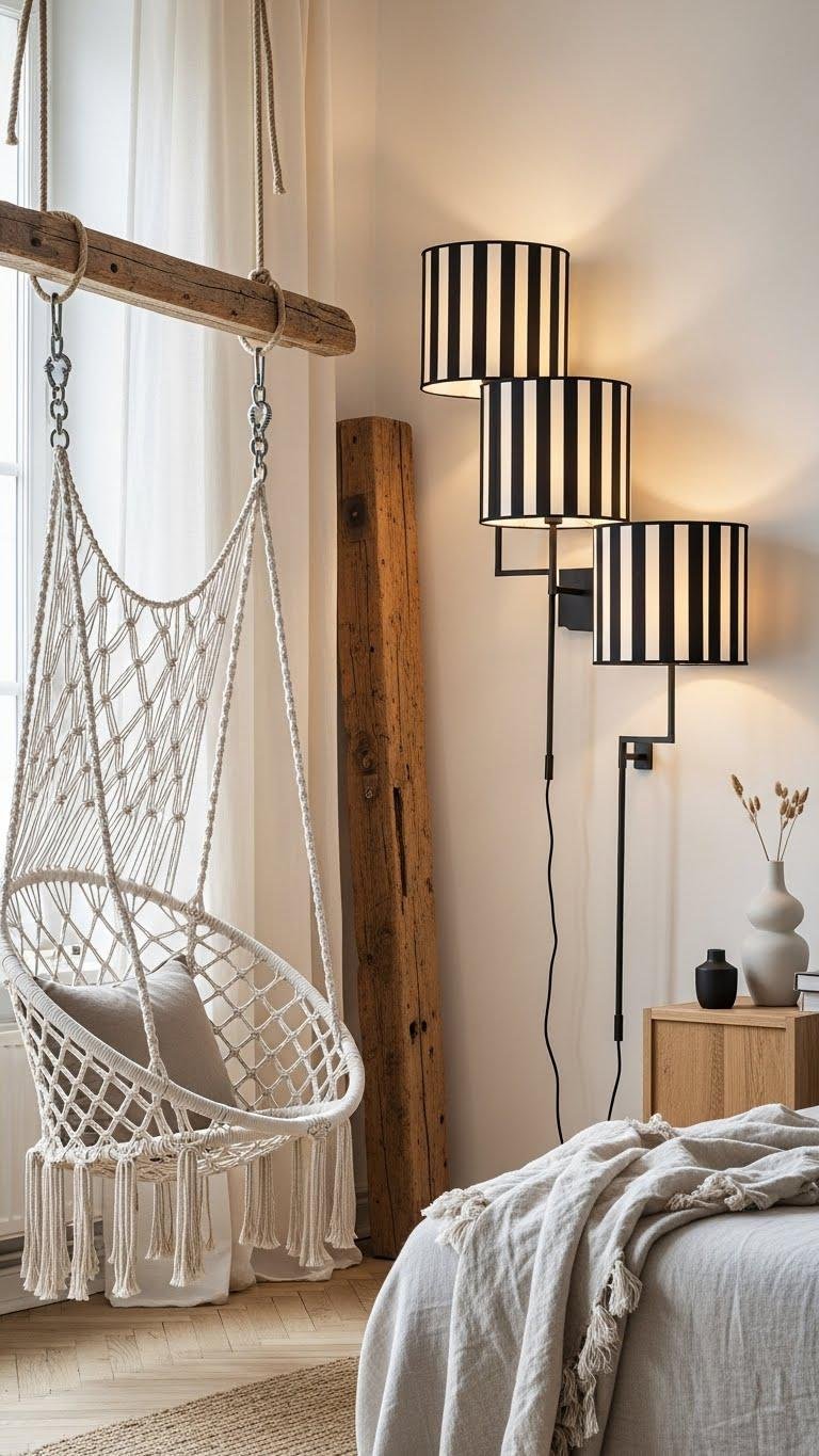 After the graphic punch of striped lamps, add a hanging chair anchored to exposed wood to introduce sculptural warmth and relaxed ergonomics. You’ll choose a macramé swing suspended from reclaimed timber for tactile contrast, crafting a Bohemian nook without clutter. Balance with Scandinavian minimal accents—lean linens, clean lines—so the seat feels like a liberated retreat, polished yet unfussy, intentional and inviting.