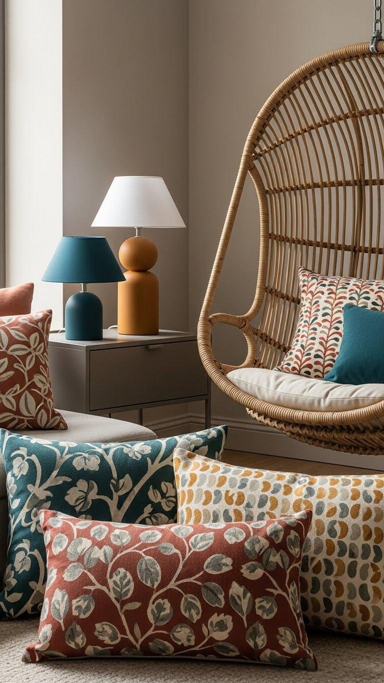 Patterned pillows tie the room together by echoing the hanging chair’s texture and the lamps’ graphic punch, so choose prints that bridge those elements without competing. You’ll mix and match confidently: pair organic motifs with geometric repeats, employ scale contrast to keep balance, and limit the palette for cohesion. Aim for curated variety that feels free, refined, and unmistakably yours.