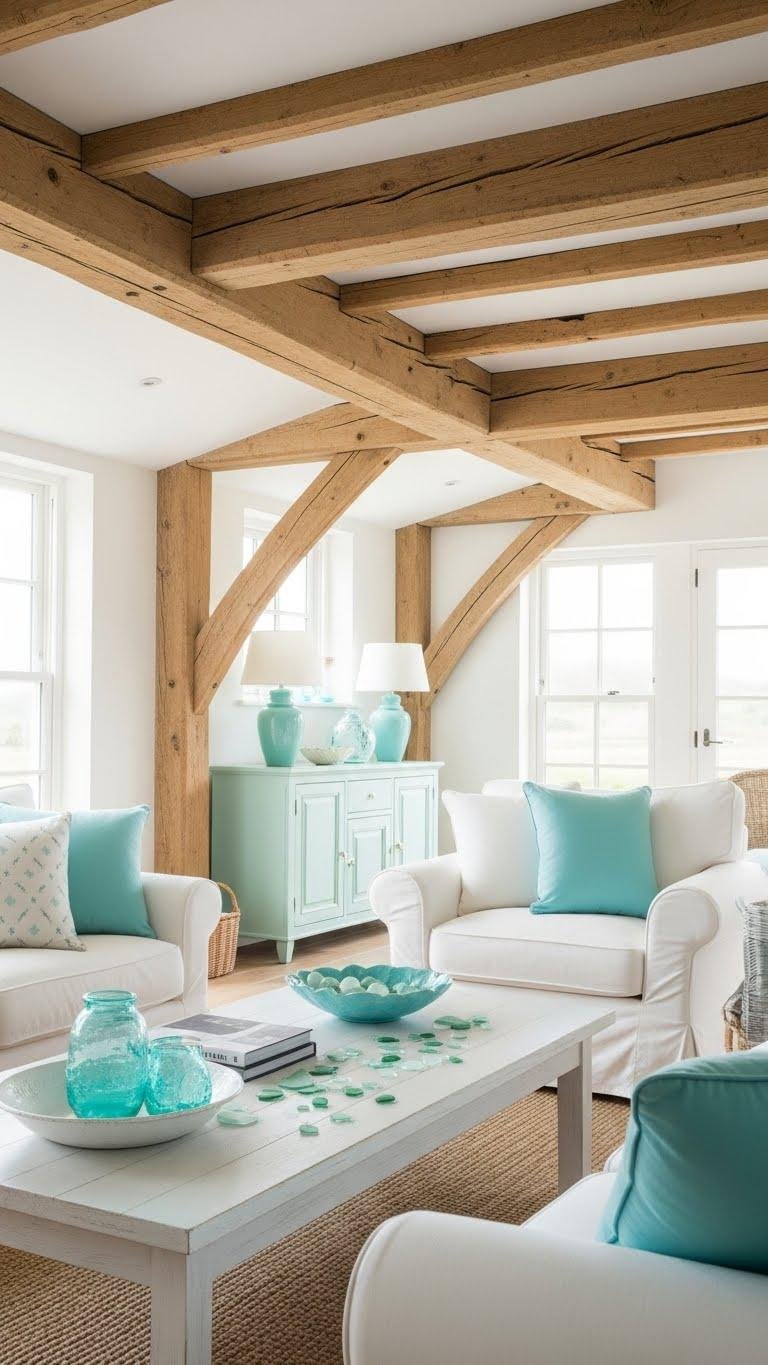 When you pair soft turquoise accents with exposed beamed ceilings, the result feels simultaneously fresh and grounded—turquoise brings a cool, airy lift while the beams add architectural warmth and texture.