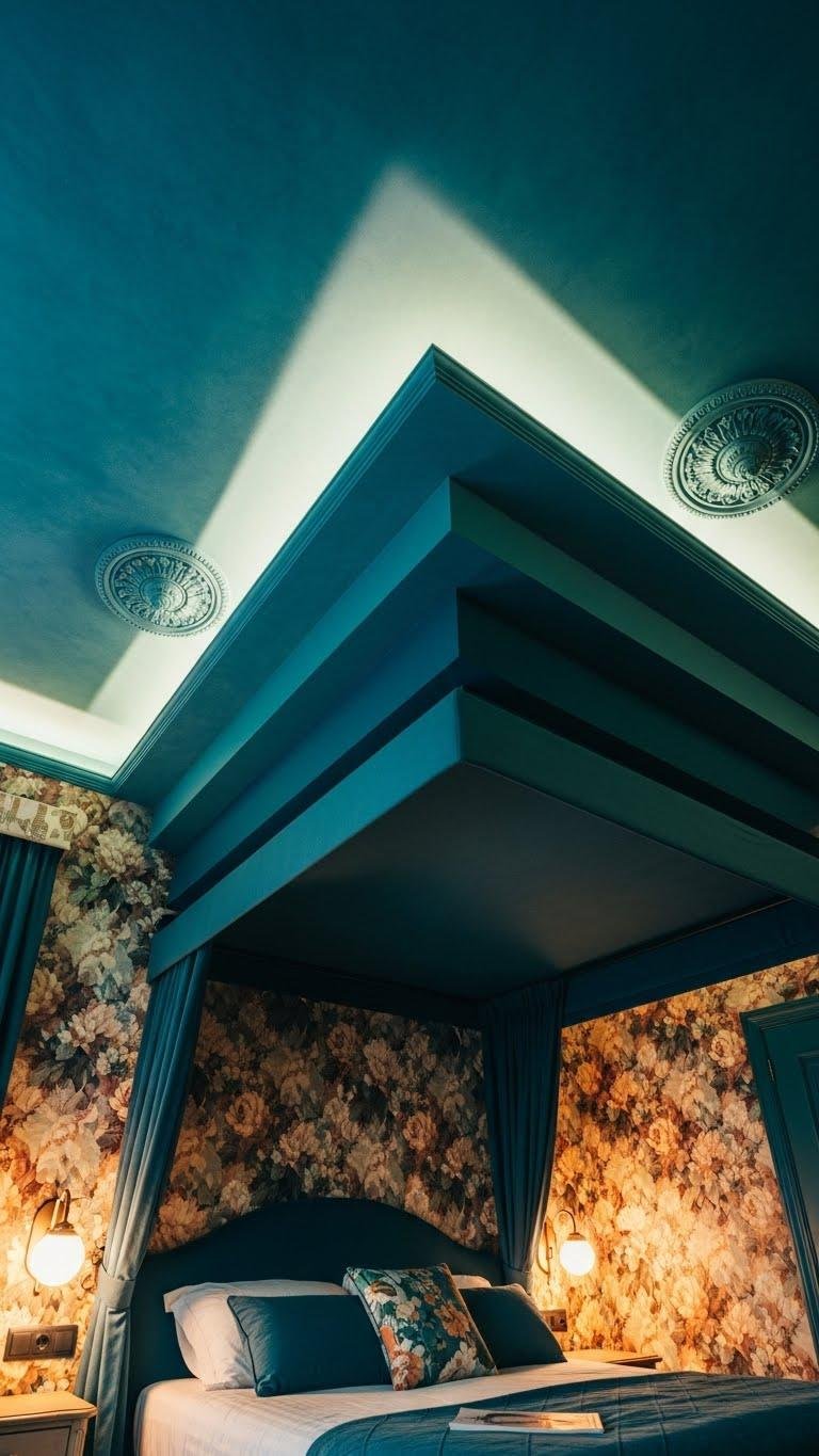 If you want a bold, fashion-forward bedroom, pair deep teal ceiling panels with floral walls to create a dynamic, layered canopy that draws the eye upward and grounds the room in rich color. You’ll balance pattern with solid depth, add sculptural ceiling medallions for vintage polish, and integrate subtle panel lighting to highlight texture — a liberated, confident look you control.