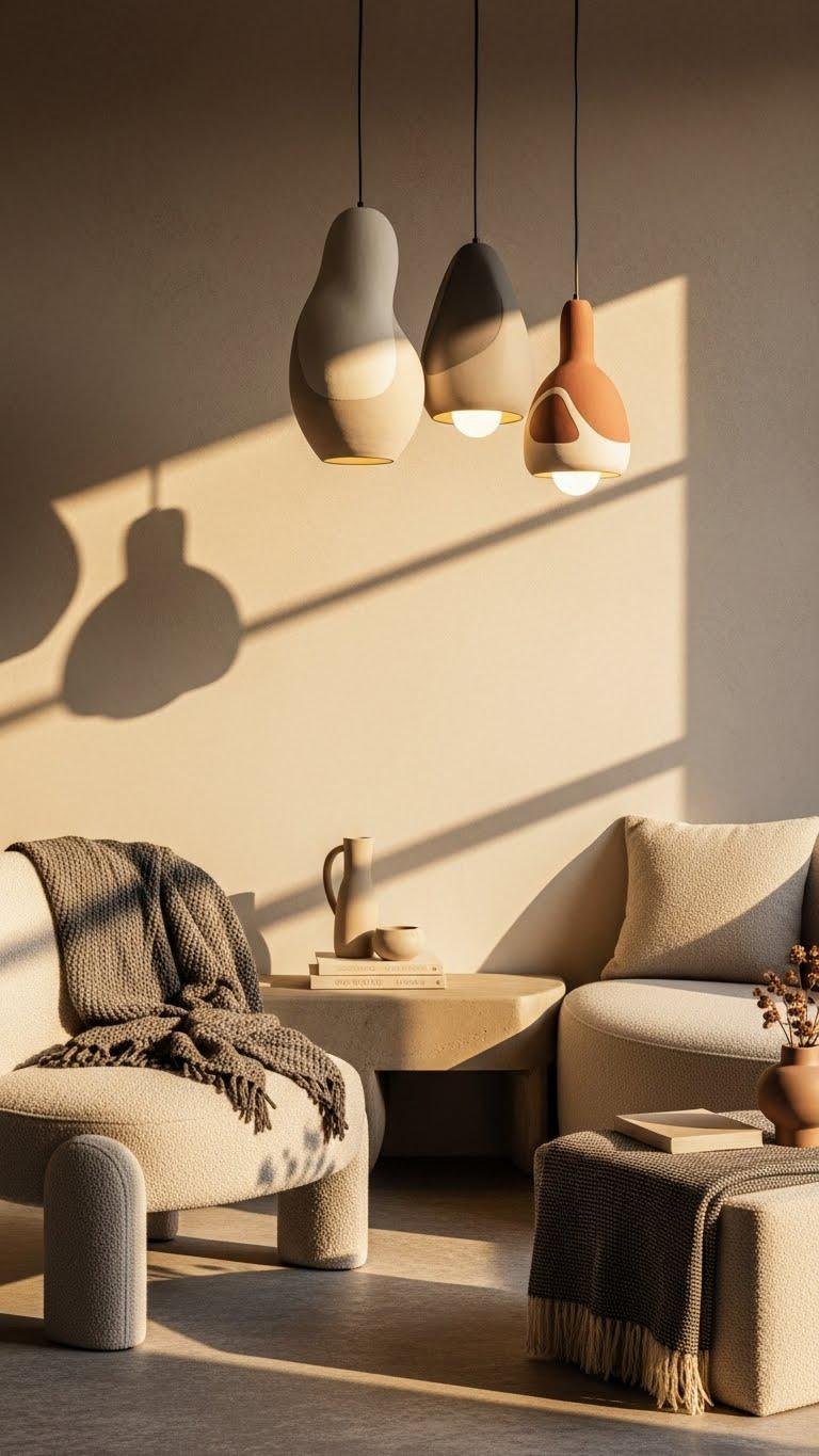 Introduce sculptural ceramic lighting to give the room a refined focal point that feels both artisanal and decidedly modern. You’ll choose artisan pendants with fluid silhouettes and matte glazes to add tactile warmth without fuss. Position them to highlight texture and free-form furniture, letting their crafted presence elevate the space. They’ll feel curated, liberating, and unmistakably polished.