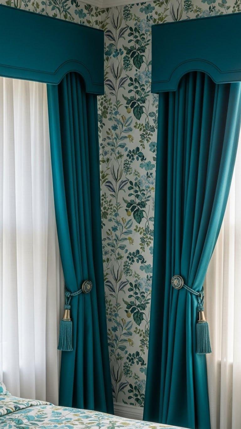 Move from the serene simplicity of pale turquoise and ivory to a bolder, more theatrical pairing by setting rich teal drapery against floral wallpaper; the deep, saturated curtains will ground the room and highlight the wallpaper’s pattern without competing with it. You’ll anchor windows with a tailored teal valance, let botanical silhouette motifs sing, and choose luxe hardware so your bedroom feels daring yet composed.