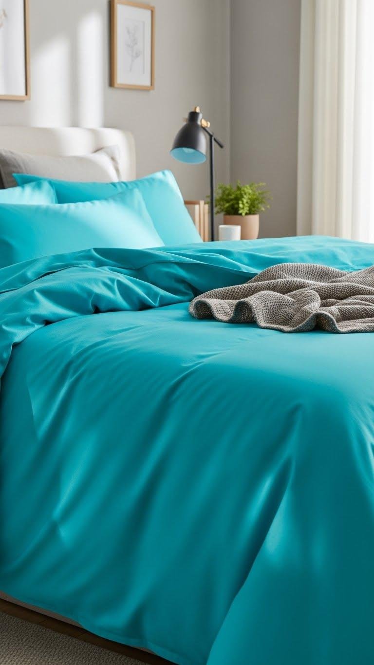 Often a bold bedding choice like bright teal instantly energizes a room, and you’ll find it balances modern flair with approachable warmth.