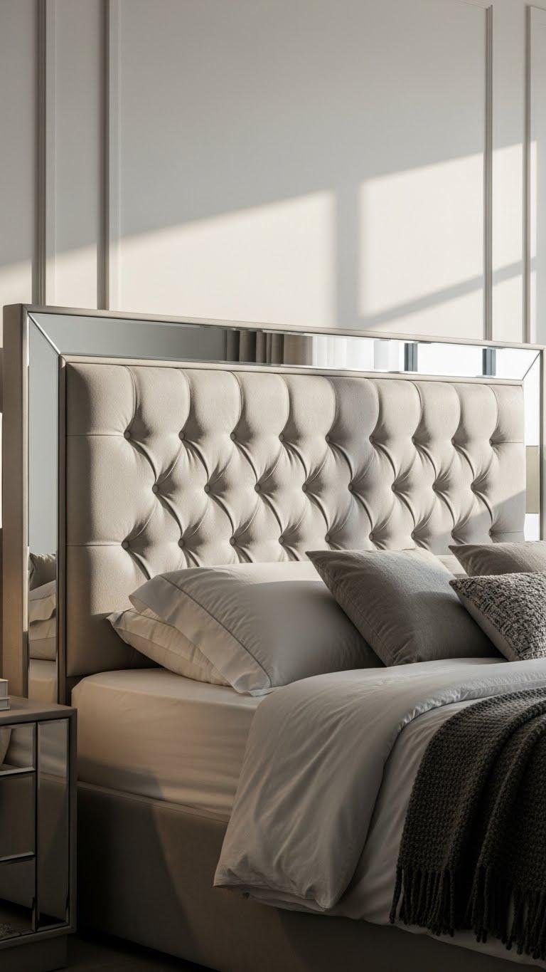 Introduce a tufted headboard with mirrored accents to anchor the room in luxe texture and reflective light—you’ll get the plush, inviting presence of deep tufting paired with small mirrored inlays or a mirrored frame that amplifies brightness and makes the space feel larger. You’ll love the refined contrast of plush buttoning against sleek mirrored trim, creating a liberated, upscale focal point that reads modern and confident.