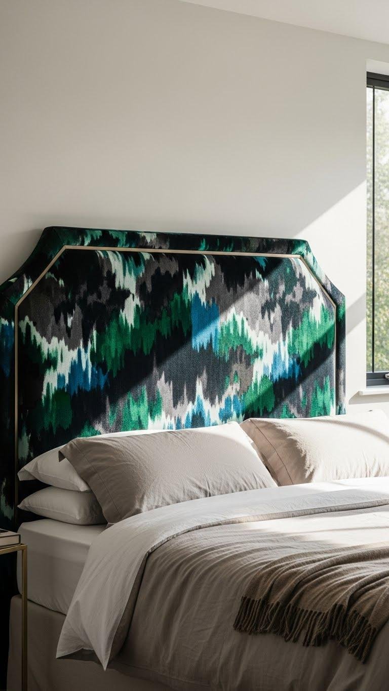Anchor the room with a patterned fabric headboard that does more than decorate—it choreographs the palette and scale of every other element. Choose printed velvet for depth and tactile luxury, then refine edges with crisp geometric piping to echo architectural lines. You’ll balance bold motifs with minimal bedding, letting the headboard command the scheme while keeping the space open, liberated, and unmistakably stylish.