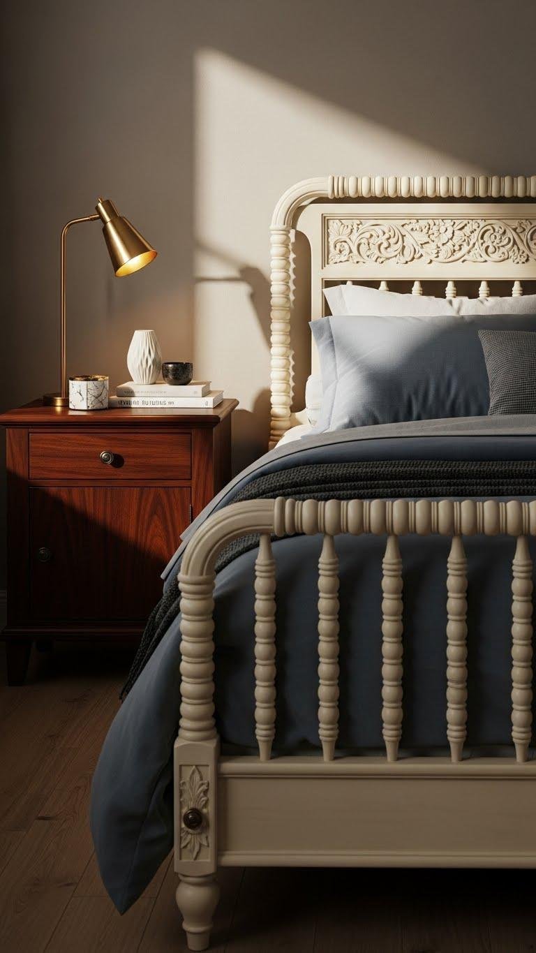 Pairing dark wood nightstands with your creamy carved spindle bed instantly grounds the airy palette and introduces a tailored warmth that reads both timeless and on-trend.