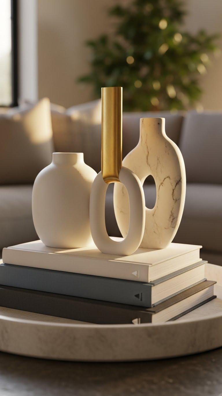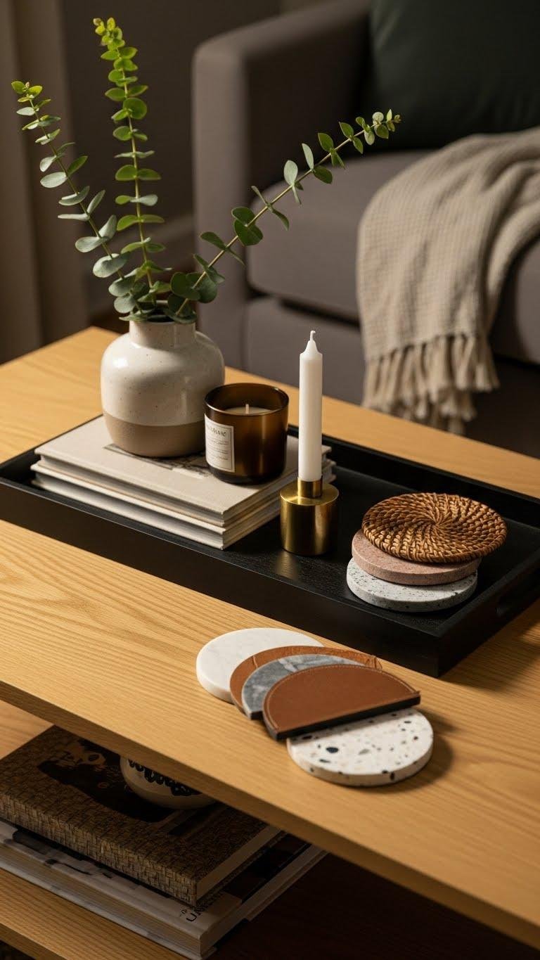 When you layer a tray on your coffee table, you create a curated little world that feels both intentional and effortless; start with a low stack of books to anchor the arrangement, then add a sculptural object—think matte ceramic, brass loop, or an abstract stone piece—for height and tactile contrast.