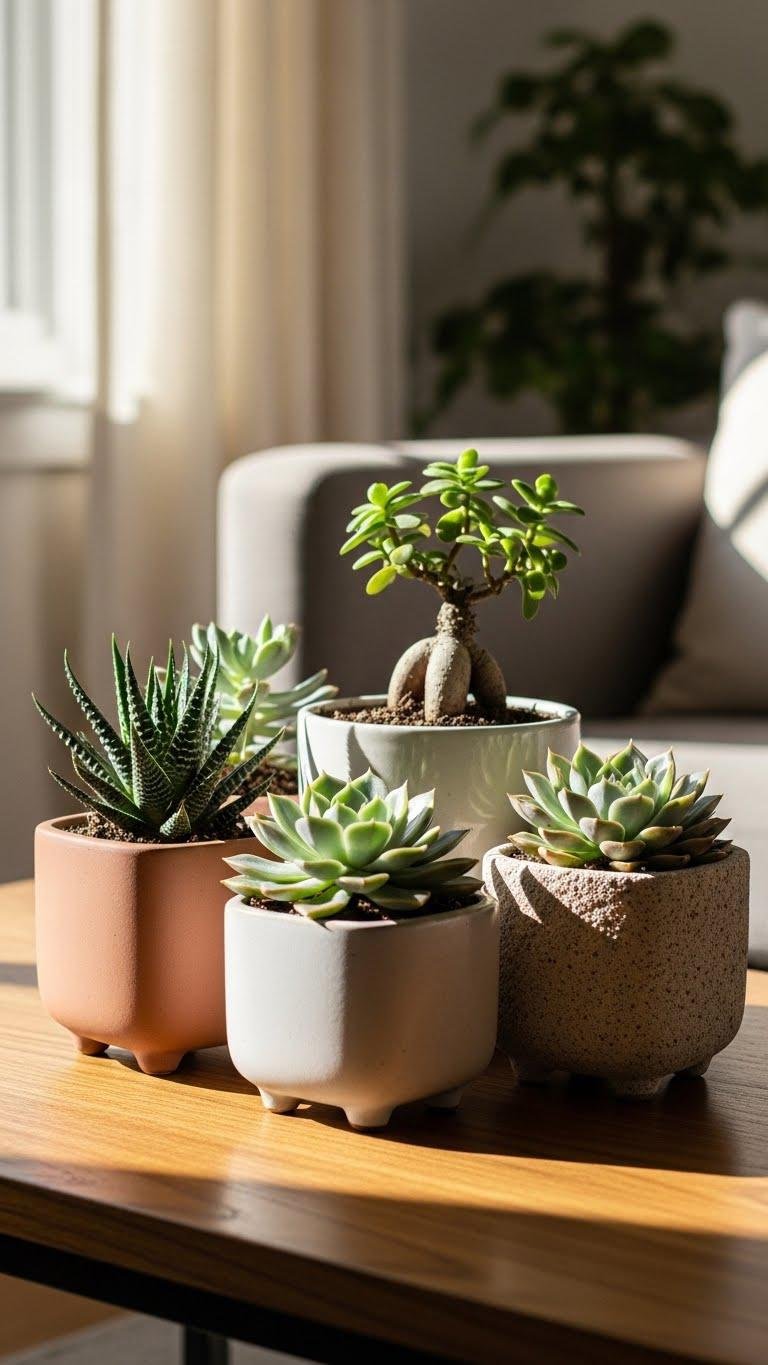 Often you’ll keep a coffee table feeling fresh by grouping low-profile plants in ceramic planters—think squat terracotta, matte-glazed porcelain, or raw stoneware—to add organic shape without blocking sightlines.
