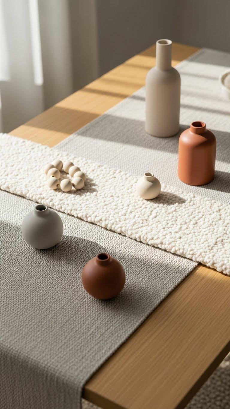 You’ll choose a neutral linen runner, layer a boucle strip for plush contrast, and scatter ceramic beads like tiny accents.