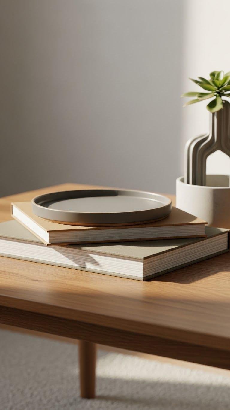 When you stack a couple of hardcover books, set a low-profile tray atop them, and finish with a small sculptural plant, you instantly introduce layered height and a curated rhythm to the coffee table.