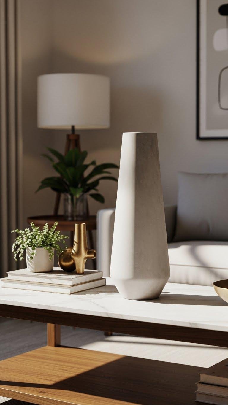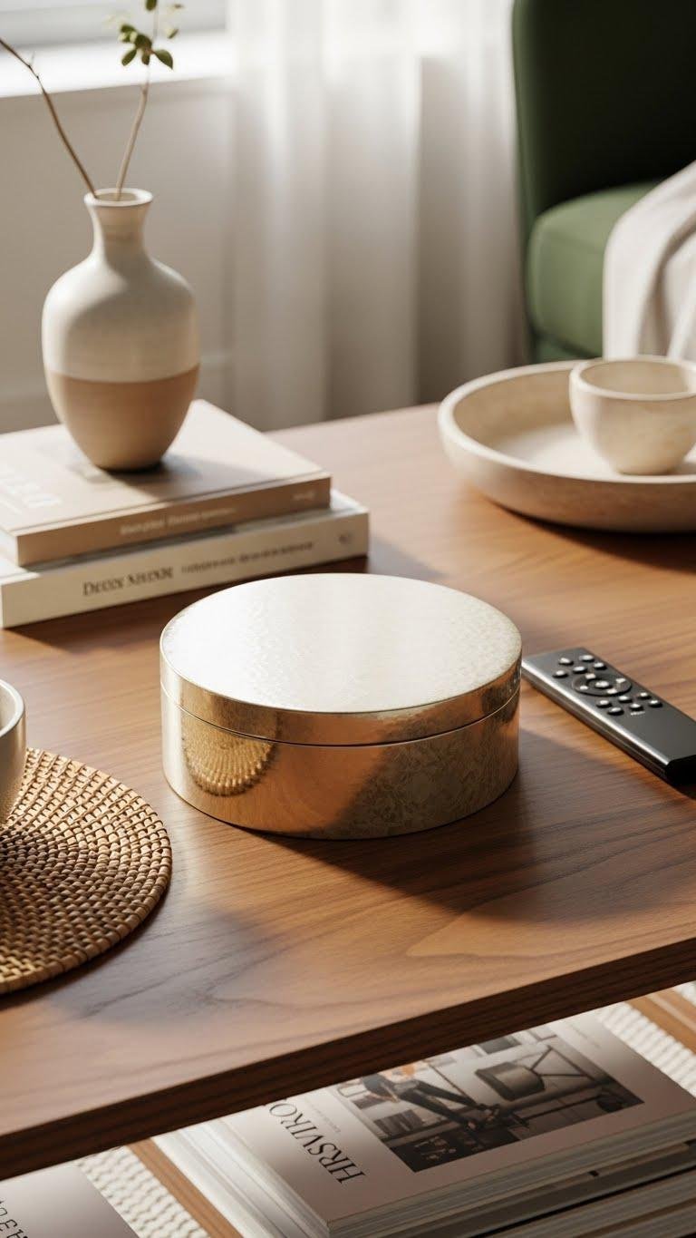If you enjoyed the interplay of shine and soil in the last vignette, carry that conversation forward by pairing coordinated metallics with a small sculptural object to give your coffee table a gallery-ready silhouette. You’ll mix matte brass with oxidized silver for contrast, then place a petite pair of hand-carved forms — an abstract duo — to keep the look liberated, curated, and confidently modern.
