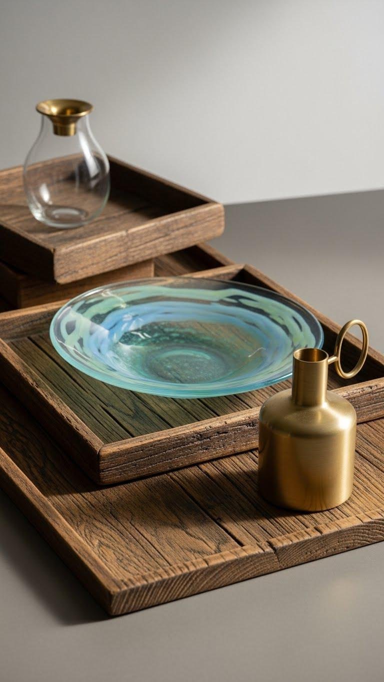 Move from the quiet simplicity of a sculptural bowl to an assembled cluster that plays up contrast and texture. You’ll combine reclaimed wood trays, a fused glass dish, and a brushed brass candleholder in a purposeful minimalist assemblage. Layer heights and negativespace, let imperfections sing, and keep pieces movable — you’ll create a liberated, modern focal point that feels curated, not constrained.