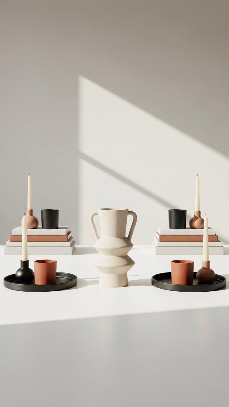 Start with a calm, balanced silhouette: place identical objects on either side of a standout centerpiece to create an instantly composed tableau. You’ll embrace mirror symmetry with purpose—think sculptural vases, stacked books, or streamlined trays—with candle pairs adding warmth and rhythm. Keep lines clean, proportions intentional, and let negative space grant the arrangement an airy, liberated confidence that feels modern and doable.