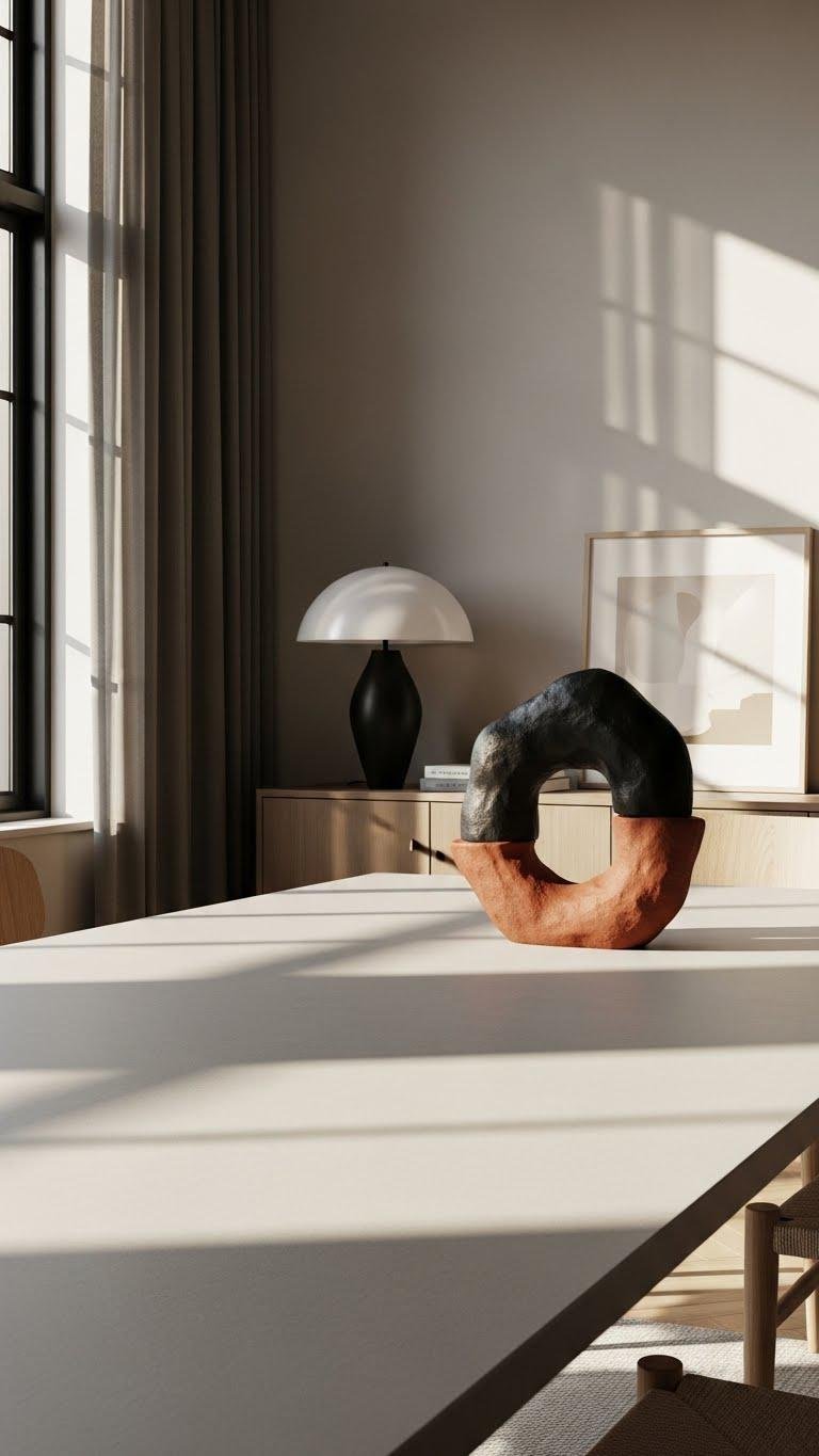 When you let one striking object take center stage, the rest of the table breathes — ample negative space makes that piece read as intentional, not clutter. You choose a bold sculpture on an empty surface, letting its form command attention.