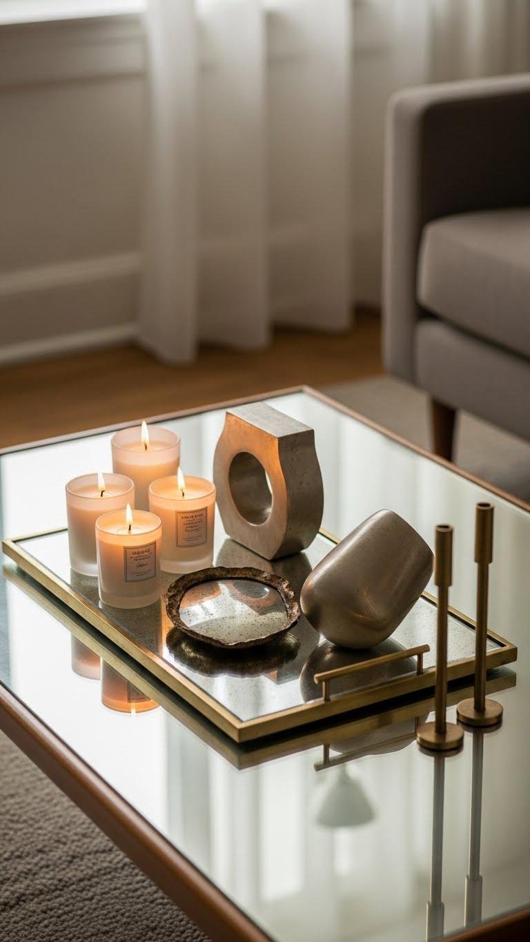 Balancing shine and restraint, a mirrored tray instantly sharpens a coffee table vignette while reflecting light to make the room feel lighter and more layered. Layer scented candles, an antique mirrorwork accent and a sculptural metal object for contrast. You’ll pair minimalist taperholders to keep lines clean, letting reflective surfaces and tactile metal create a liberated, modern focal point that feels curated, not cluttered.