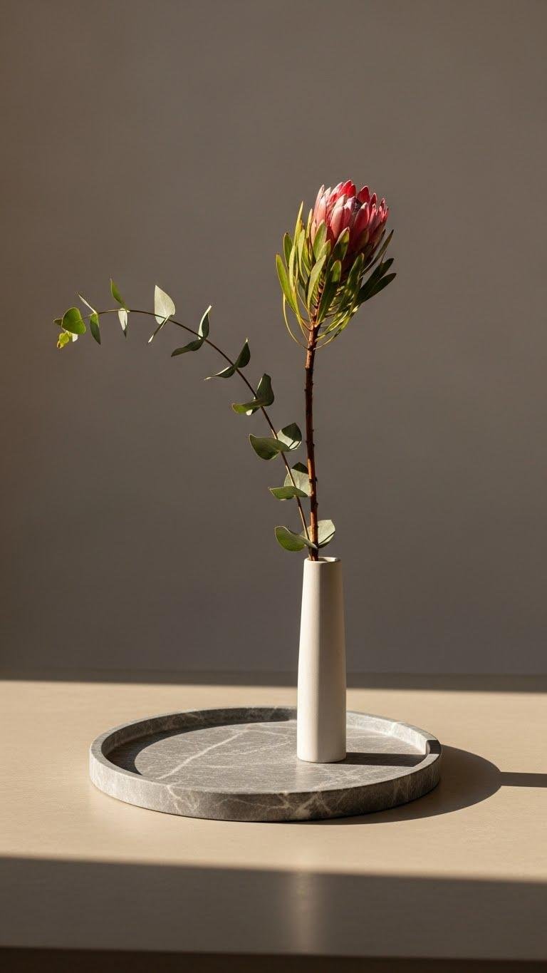 A stone or marble tray anchors your coffee table with quiet luxury, and a single stem—whether a sculptural eucalyptus branch or a bold protea—adds a sculptural, editorial touch.