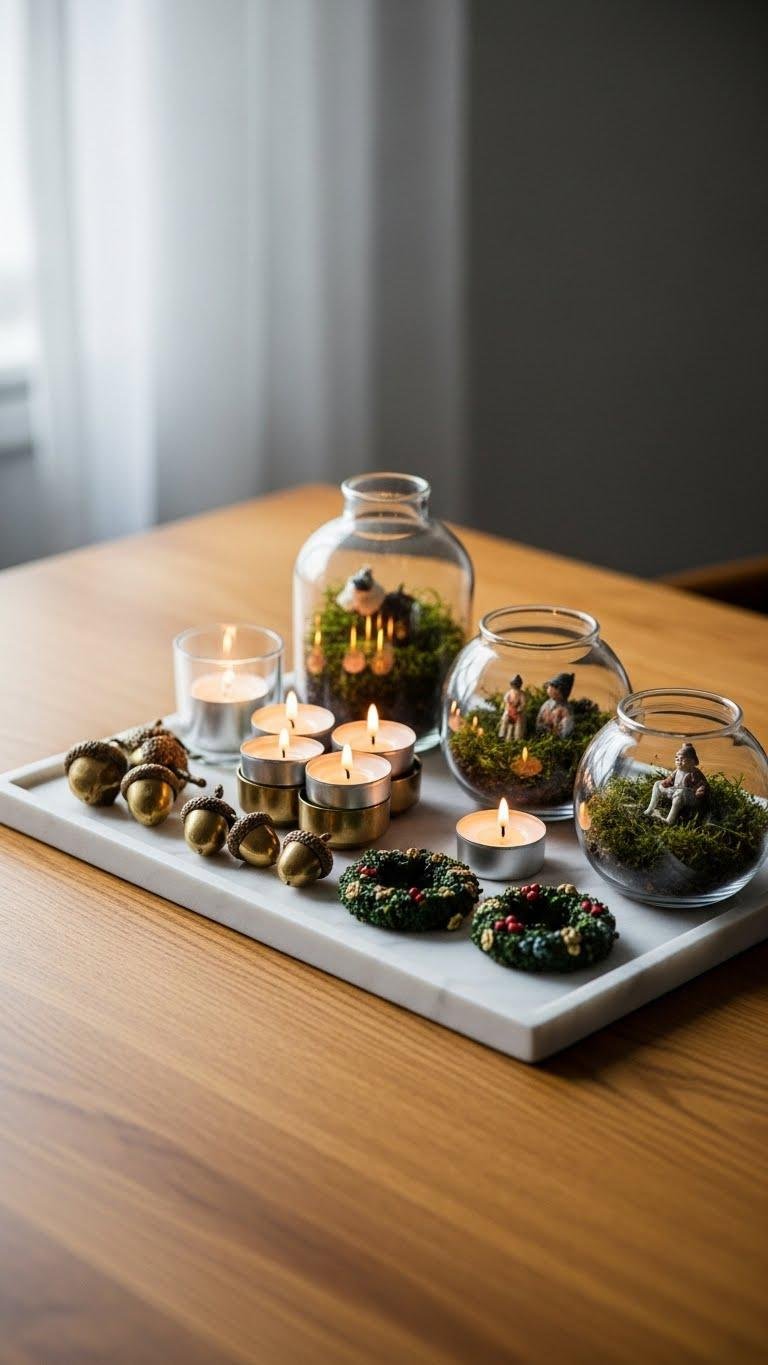 If you liked the quiet restraint of a single-stem marble tray, bring that same edited sensibility to a seasonal rotation display with a handful of small ornaments. You’ll swap miniature wreaths for brass acorns, cluster tiny candles, or change seasonal terrariums filled with moss and miniatures. Keep scale minimal, colors cohesive, and placement loose so your table breathes and adapts.