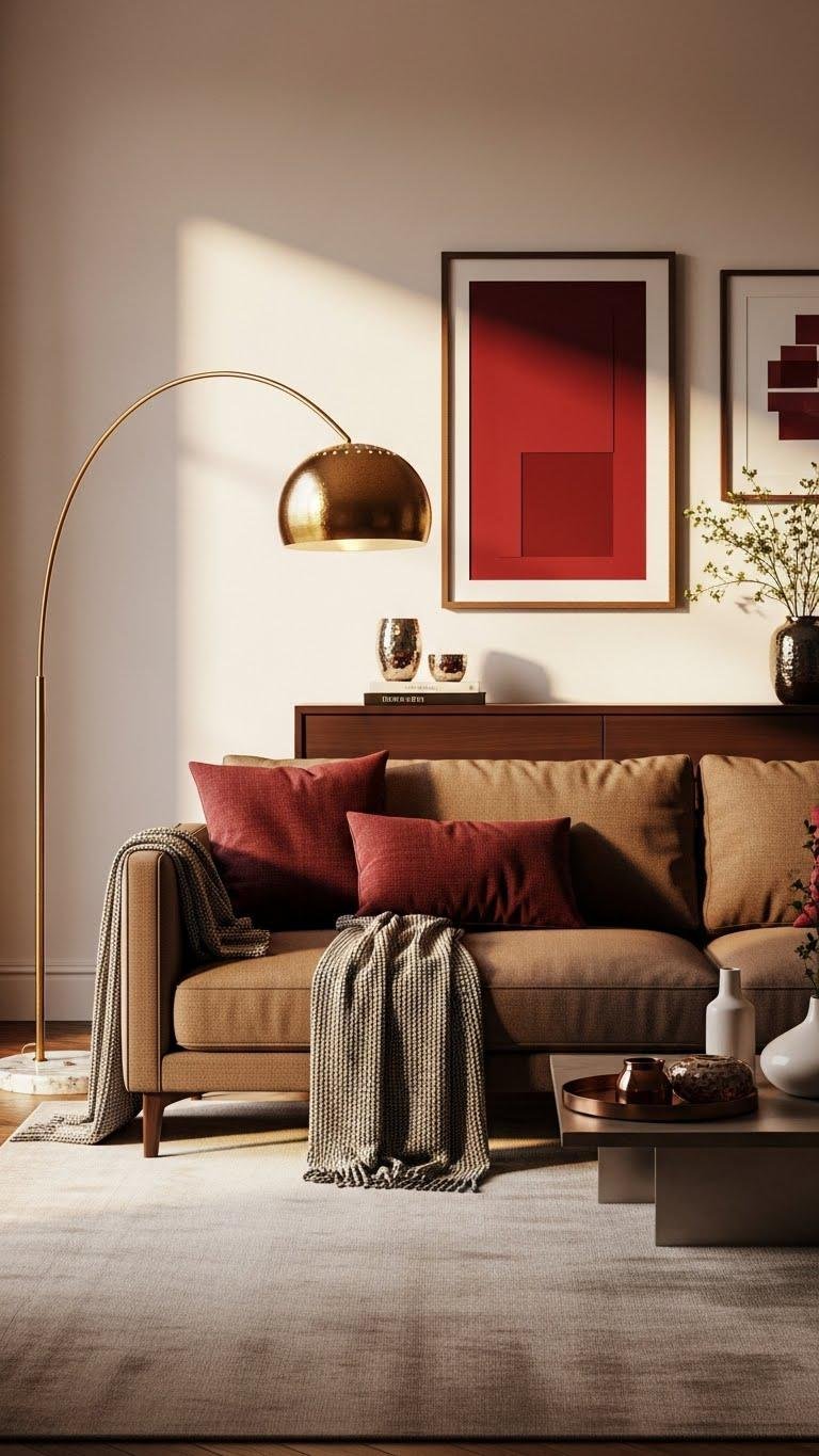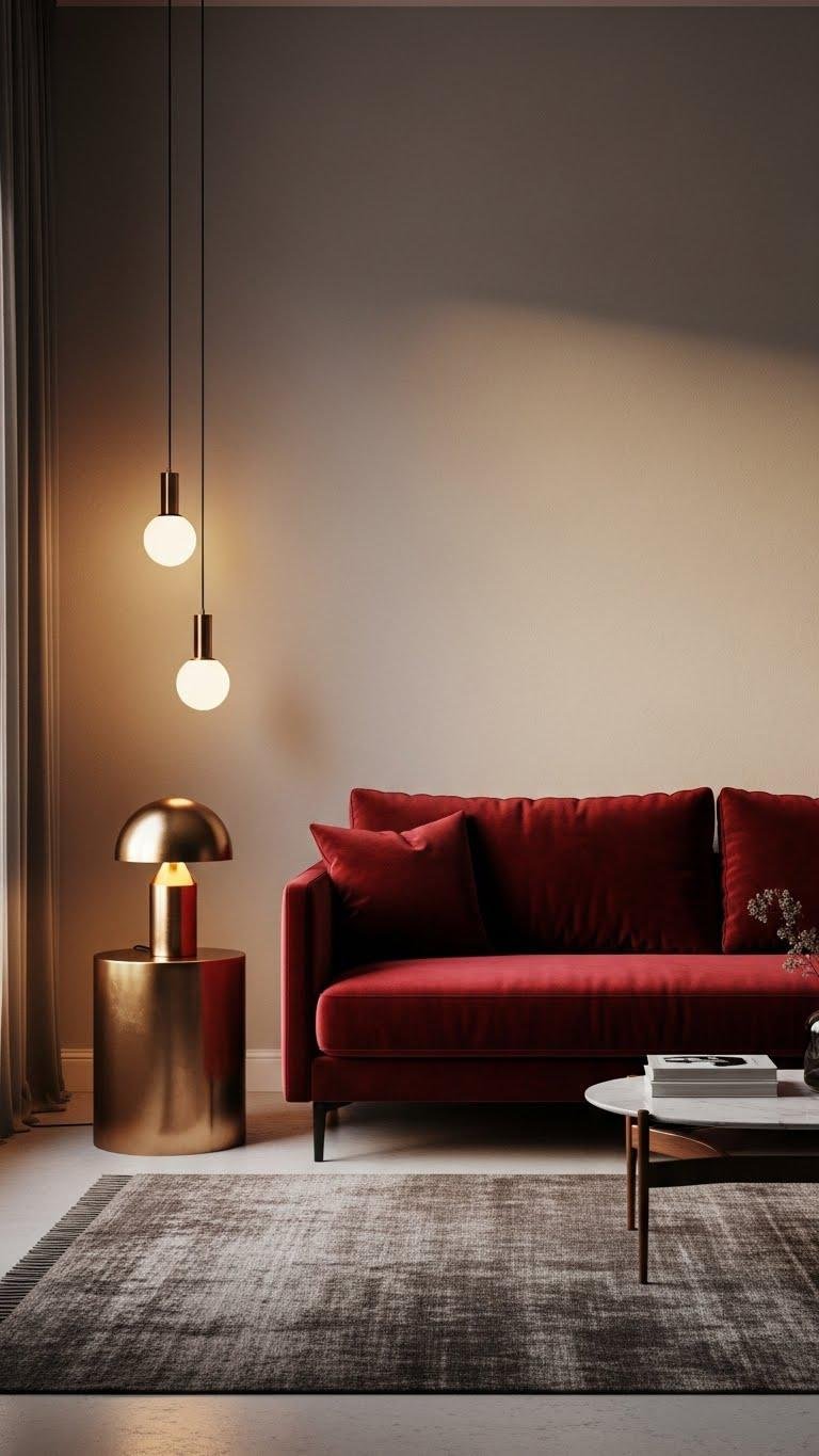 Anchor the room with a statement velvet sofa in deep red to instantly lift a muted palette—its plush texture and saturated hue bring warmth, drama, and polish without shouting.