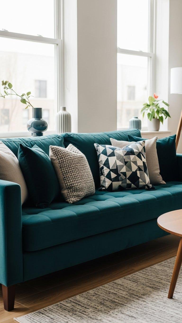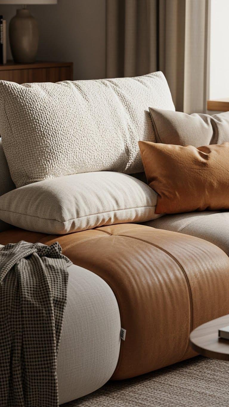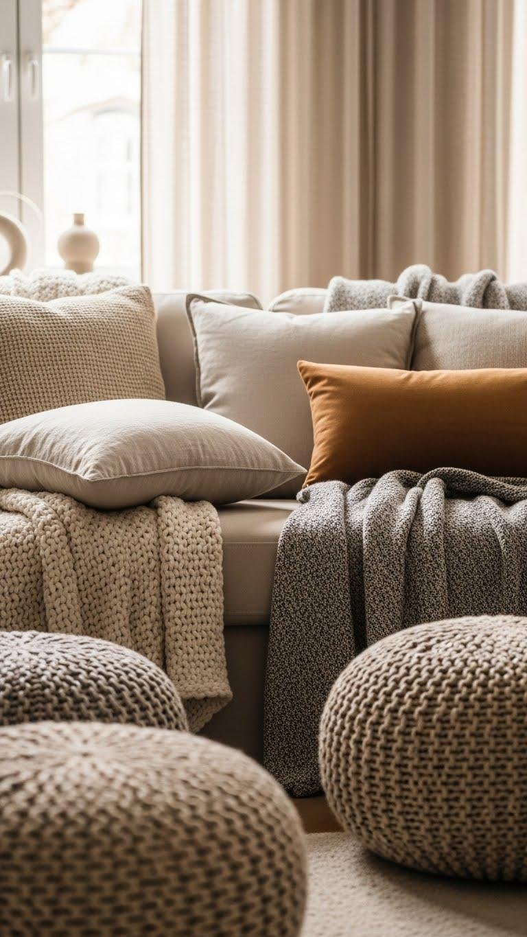 You’ll mix contrasting textures—velvet, boucle, linen—to create depth, then add geometric pillows for punch.