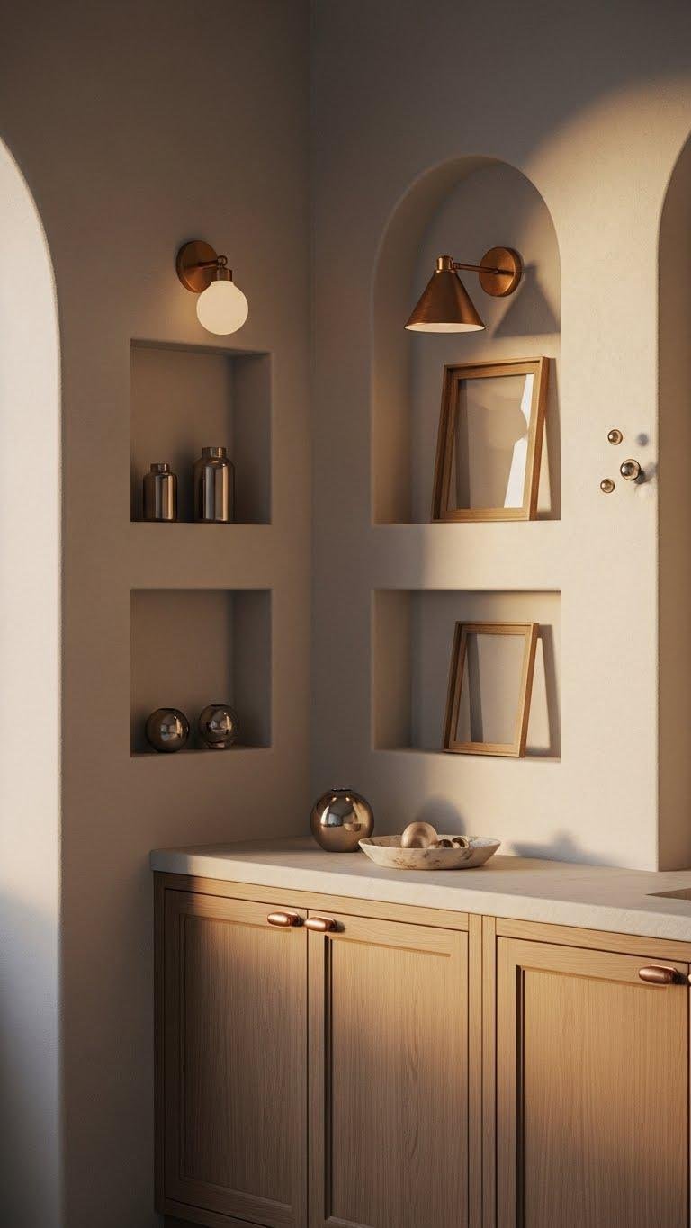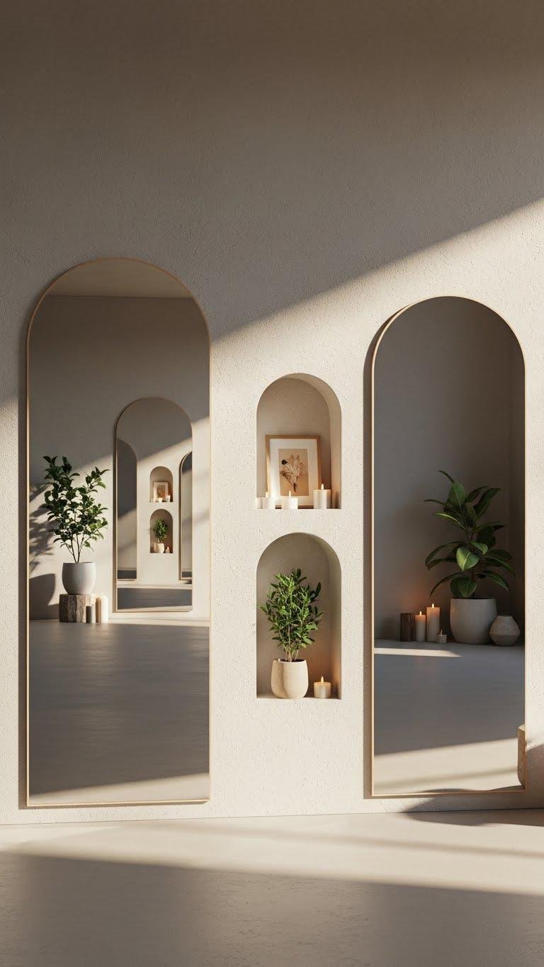 If you want to soften hard lines and add quiet drama, introduce arched mirrors and gentle niches — they bounce light, create depth, and give walls an architectural rhythm without heavy renovation. You’ll love how arched alcoves frame plants, art, or candles; mirror niches double space and reflect mood. Keep lines clean, colors muted, and placements unexpected for that liberated, Pinterest-ready vibe.