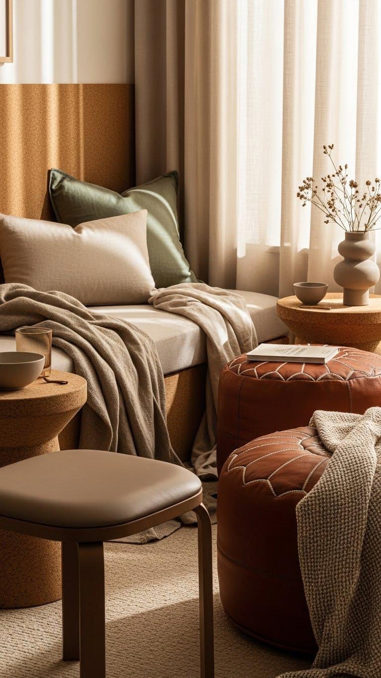 Swap traditional leather for chic vegan hide on stools and poufs, layer breathable linens, and introduce cork accents for warmth and texture. You’ll craft a liberated, sustainable space that feels luxe without compromise.