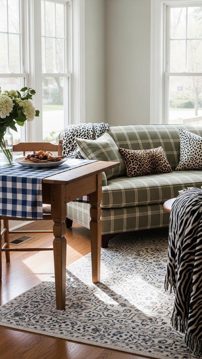 When you mix gingham, plaid, and animal prints thoughtfully, they give a room instant personality without feeling chaotic. You’ll balance gingham tablecloths with plaid upholstery, choosing colors that echo each other. Add animal print accents sparingly — a pillow or throw — and play with mixed scale patterns to keep the look bold, free, and effortlessly curated.