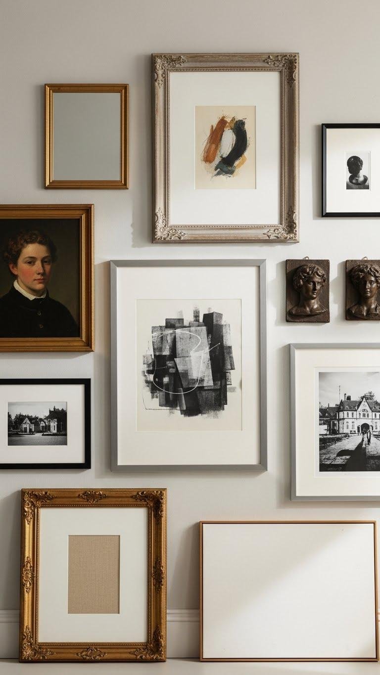 You’ll mix vintage finds with sleek modern pieces, choosing curated frames and mixed mediums for texture and contrast.