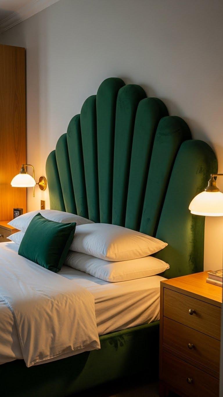 Choose a scalloped headboard with velvet upholstery and a dramatic curved silhouette, pair it with minimal bedding, warm wood, and vintage brass accents to create a liberated, luxe retreat.