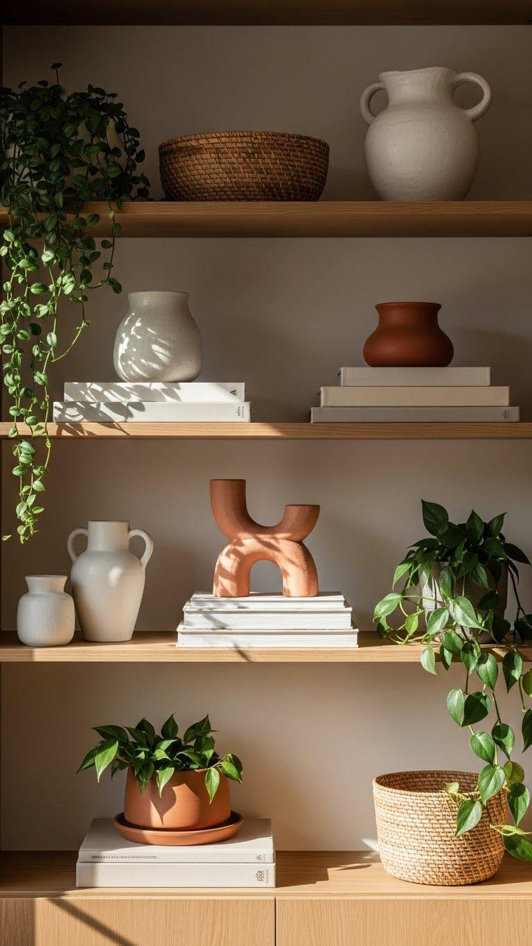 If you want open shelving to feel curated instead of cluttered, edit ruthlessly and mix objects with plants for contrast and rhythm. You’ll balance curated potterry, sculptural books, and found objects, leaving negative space to breathe. Add cascading philodendrons for movement and soften edges. Keep palettes restrained, layers intentional, and allow each piece to sing—your shelves should feel free, personal, and effortlessly styled.