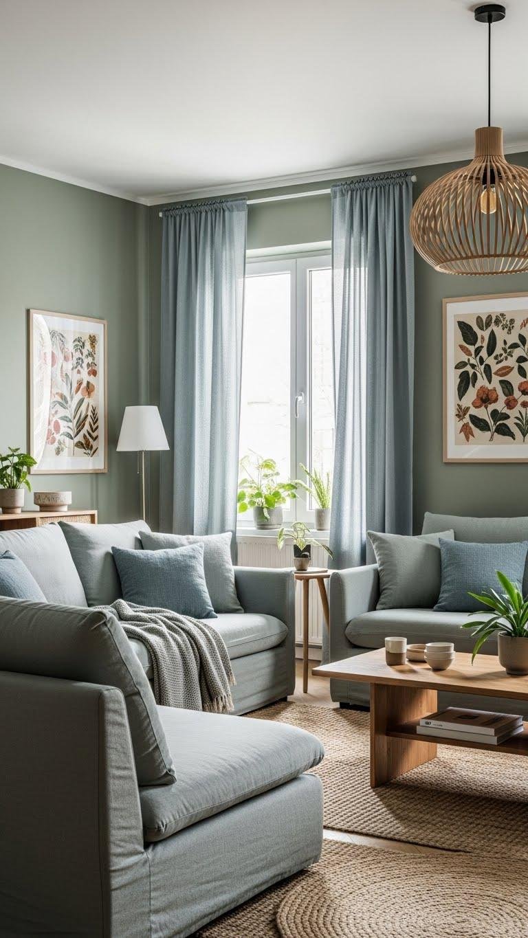 After the bold, jewel-toned energy of a color-drenched room, you can calm the rhythm with an earthy sage paired with soft blues for a chic, collected feel.