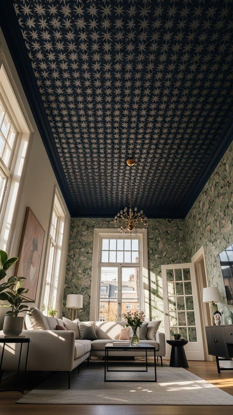 If you want to surprise the eye without overwhelming the space, wallpaper the ceiling to introduce pattern, color, or texture where it’s least expected. Go bold with metallic stars for a night-sky vibe or choose botanical murals that lift the room.