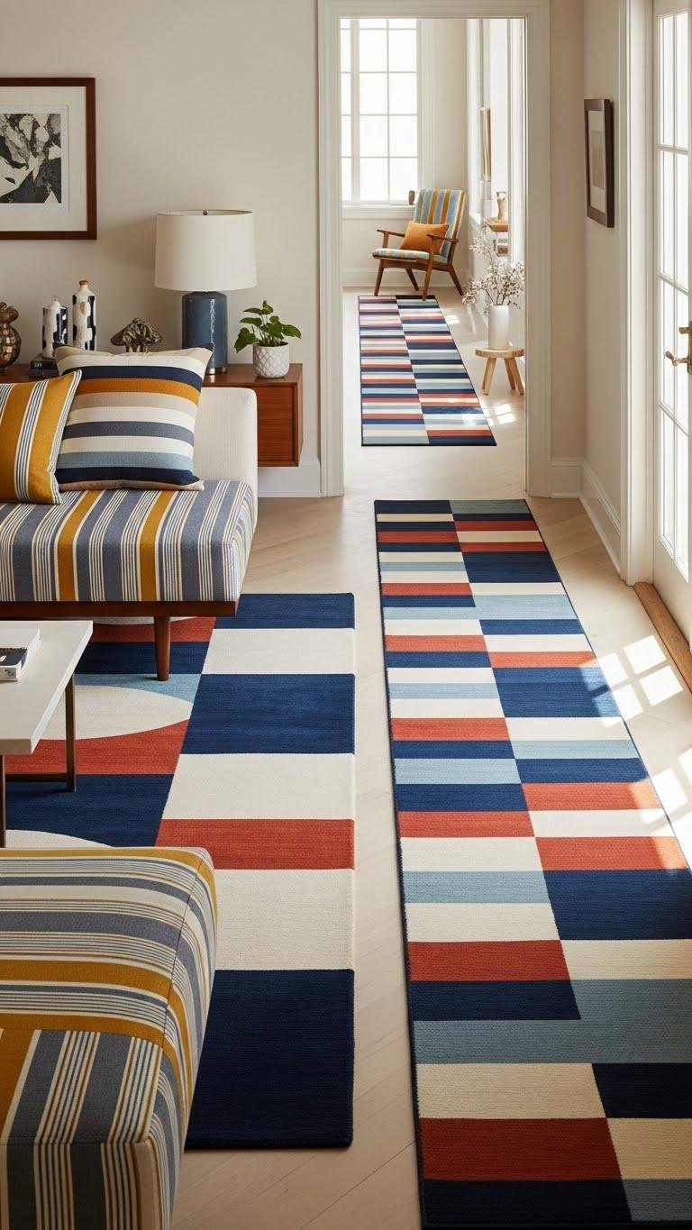 Choose geometric runners to elongate halls and anchor seating, then add striped cushions for rhythm and contrast. Mix scale — large rugs, narrow stripes — keep colors cohesive, and let patterns roam. It feels free, modern, and effortlessly curated.