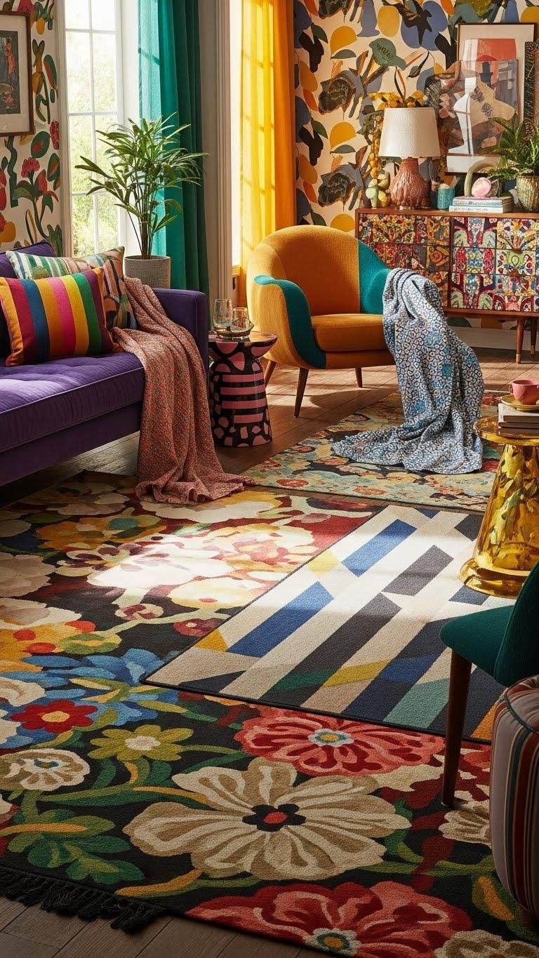 When you layer in bold patterned rugs and striped textiles, the room instantly gains personality without a single heavy piece of furniture.