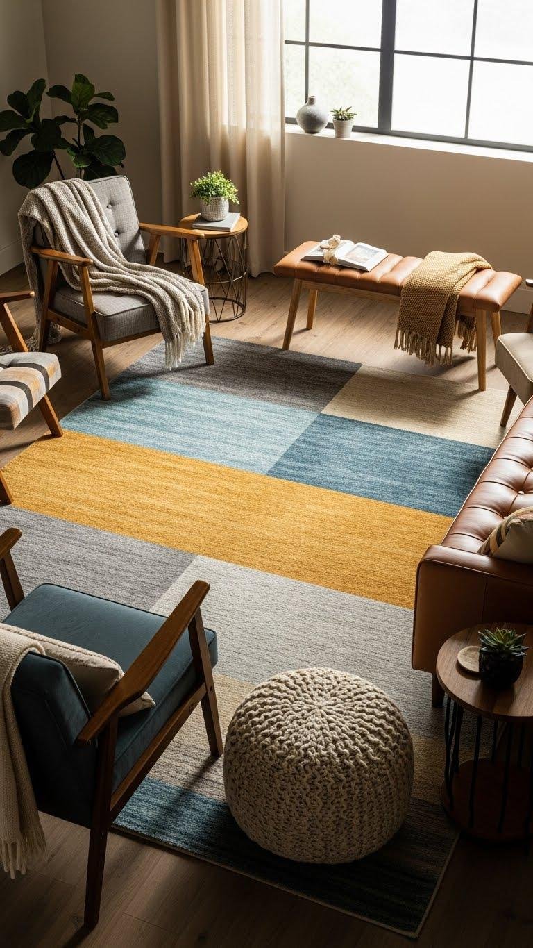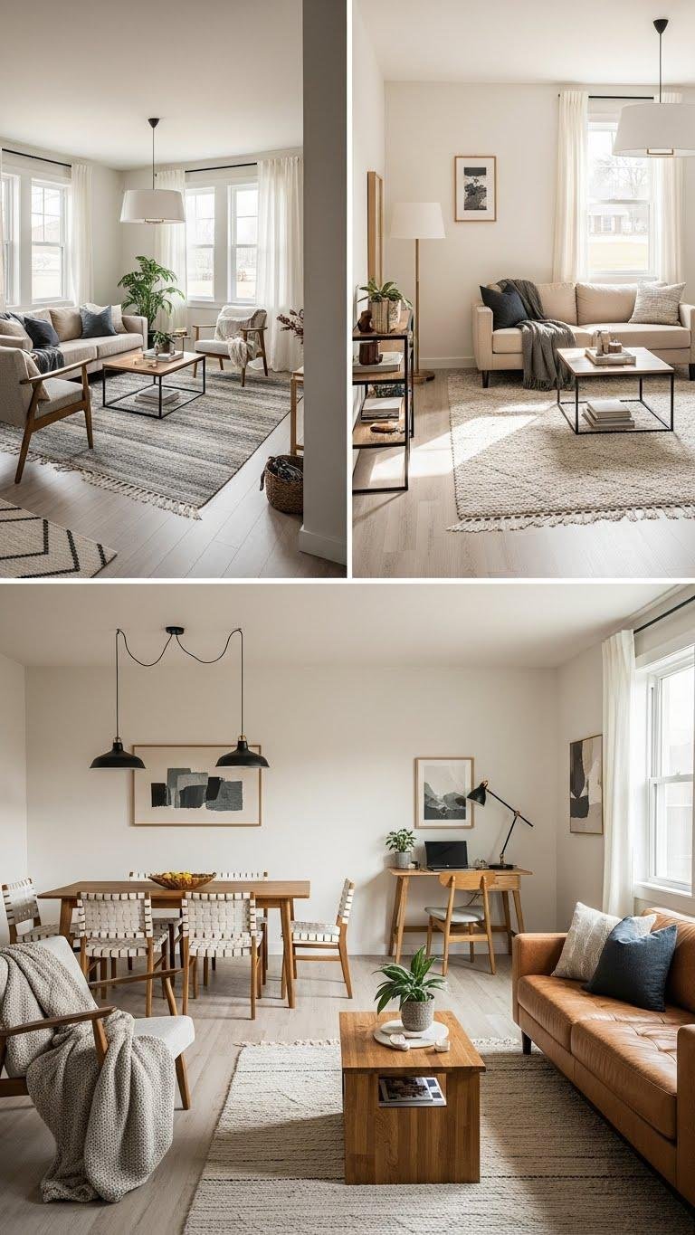 In open or multi-use spaces, anchor each area with an appropriately scaled rug and intentional furniture grouping so you can define function without building walls.