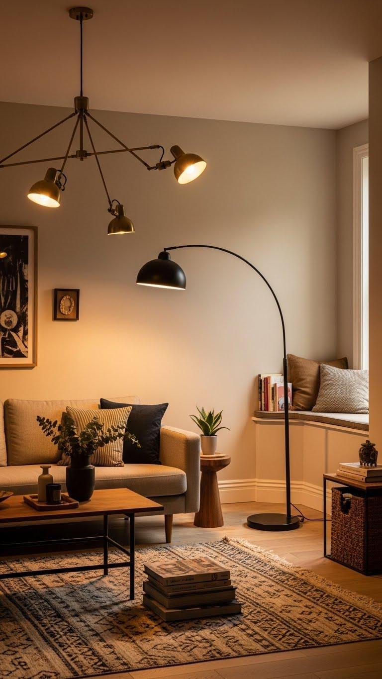 You’ll pick adjustable pendants to shift mood and sightlines, and a sculptural floorlamp to anchor a cozy corner. Let scale, finish, and placement create rhythm so your eclectic mix feels intentional, not chaotic.