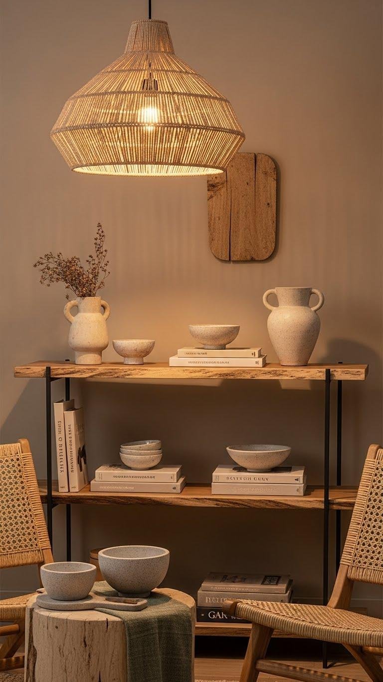 You’ll choose a sisal pendant, woven chairs, and a live edge shelf to anchor collections without clutter.