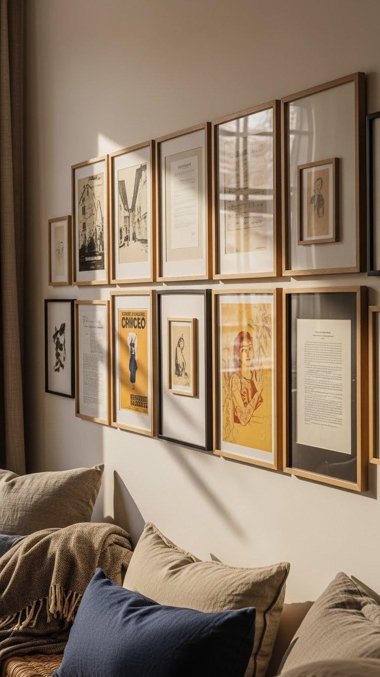 You’ll mix framed documents, posters, and small originals, arrange by scale and negative space, and set a rotation schedule so the display breathes.