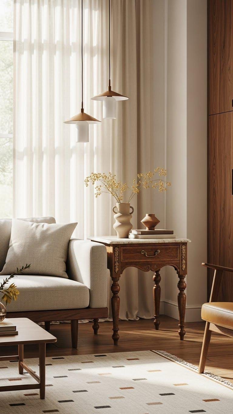 You’ll mix antique silhouettes—think turned legs or brass hardware—with streamlined sofas and minimalist lighting.