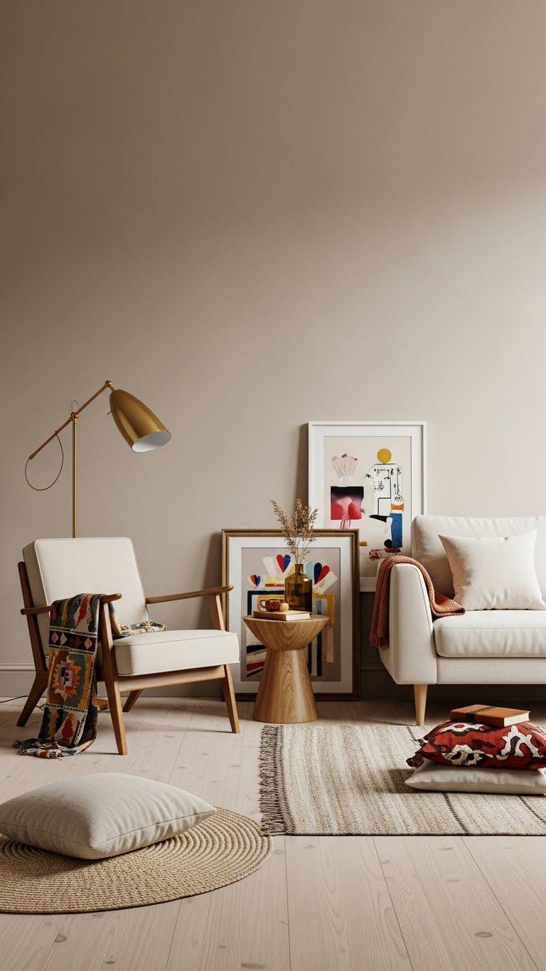 Against a calm, neutral backdrop your eclectic pieces can truly sing — muted walls, simple flooring, and restrained upholstery give vintage finds and bold accessories room to breathe.