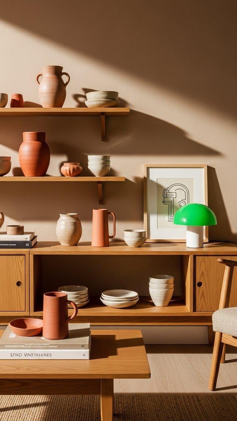 You’ll mix pieces from local claymakers with found objects, letting irregular shapes and tactile glazing anchor shelves, tables, and nooks. Curate sparingly: one statement vessel or a trio of varied sizes gives freedom without clutter, proving craftsmanship elevates casual, collected interiors.