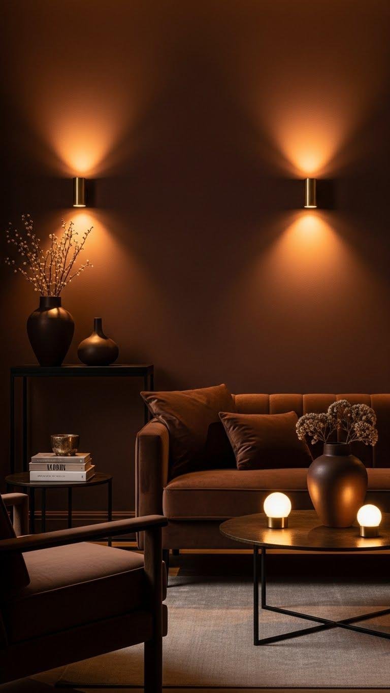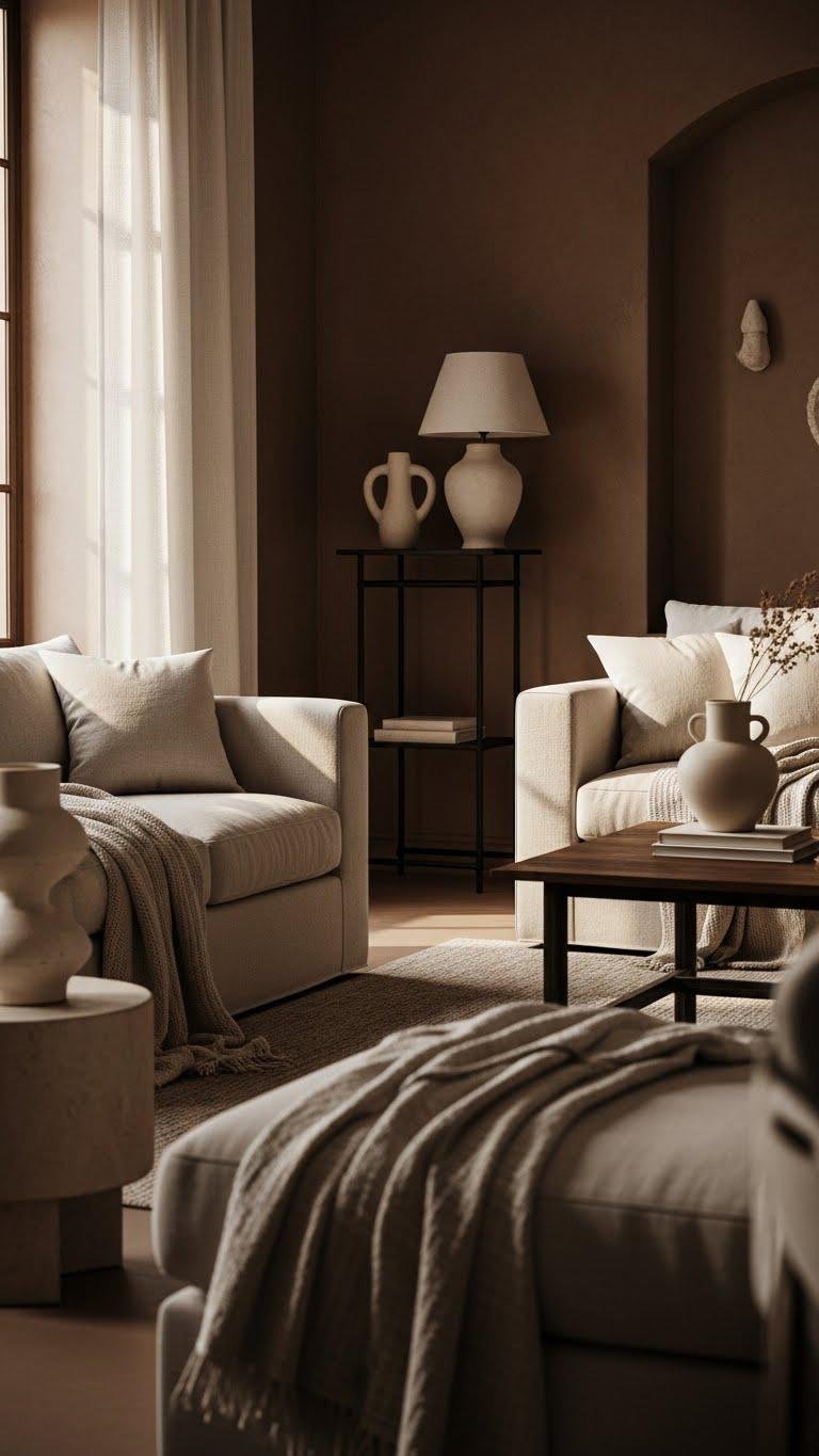 After grounding the room in chocolate brown, soften and lift the palette by layering warm off-whites and creams—these hues bring breath and natural light without erasing the depth you’ve created.