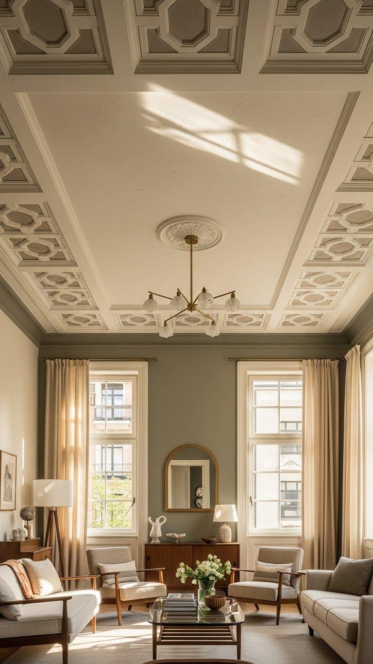 You can choose subtle stucco for organic depth or coffered wallpaper for graphic drama; both elevate without overpowering. Apply sparingly, pair with simple lighting, and let the ceiling whisper sophistication while you enjoy creative freedom.