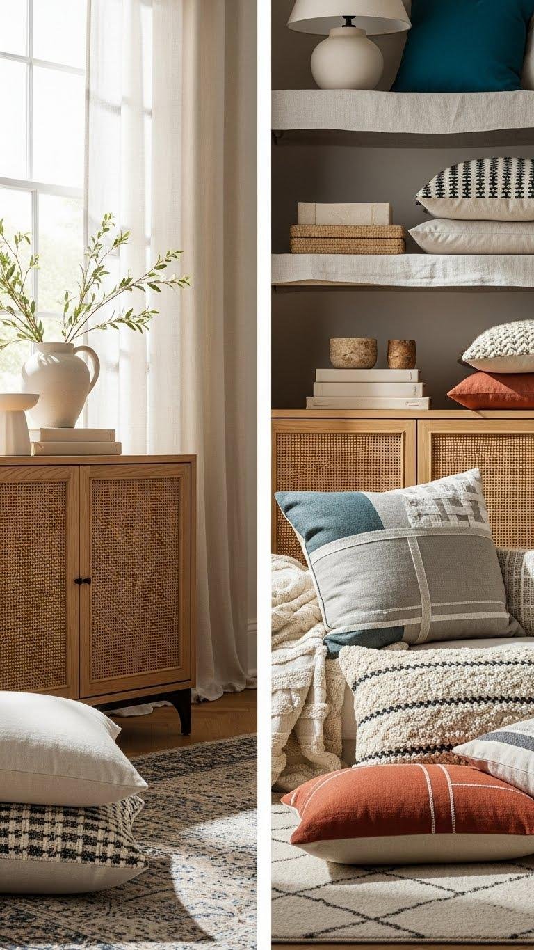 Once you’ve introduced woven cabinet fronts and linen-wrapped shelves to add tactile warmth, layering soft textiles will amplify that lived-in, curated feeling. You’ll mix rugs, drapery, and throw pillows with textured layering and subtle pattern juxtaposition, choosing scale and restraint. Let neutrals anchor freedom-loving spaces while bold accents punctuate mood, creating depth without clutter or forced symmetry.