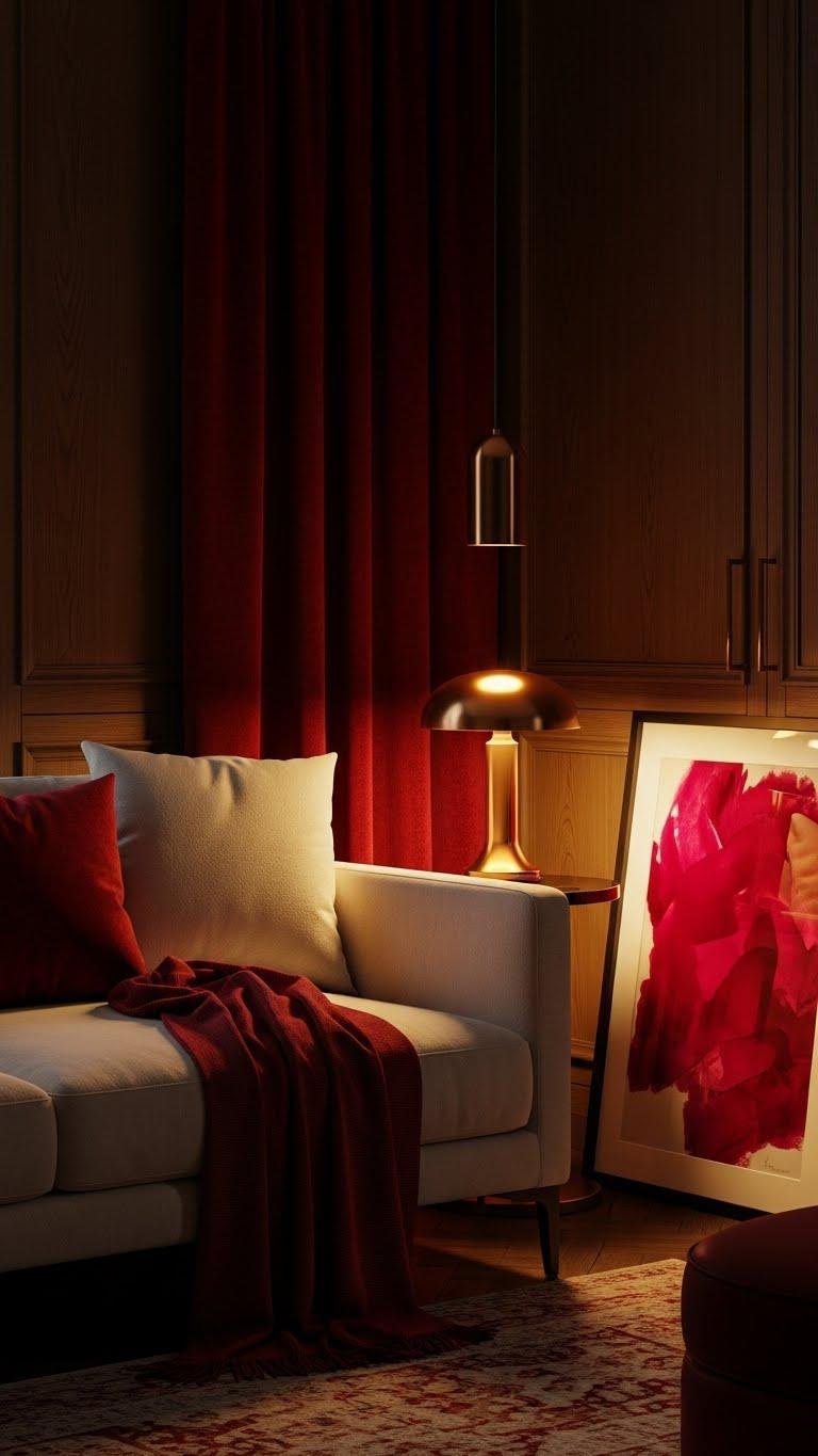 Introduce deep reds and burgundy as deliberate punctuation—use them sparingly to puncture the chocolate-and-cream base with warmth and drama. You’ll choose velvet drapery, a burgundy throw, or artwork to anchor a room without overwhelming it. Pair those touches with oxidized brass hardware or lighting for vintage richness. The result feels confident, modern, and free — intentional color that speaks, not shouts.