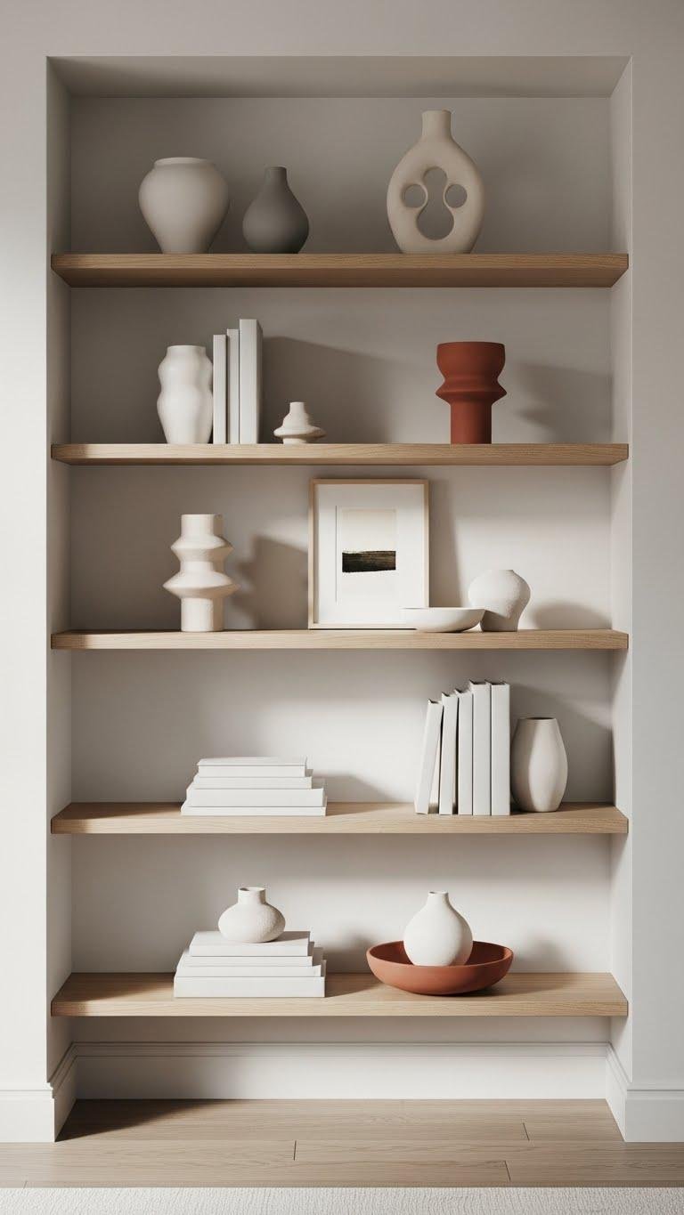 You’ll arrange minimalist vignettes with curated symmetry, mixing artful objects, books and ceramics.