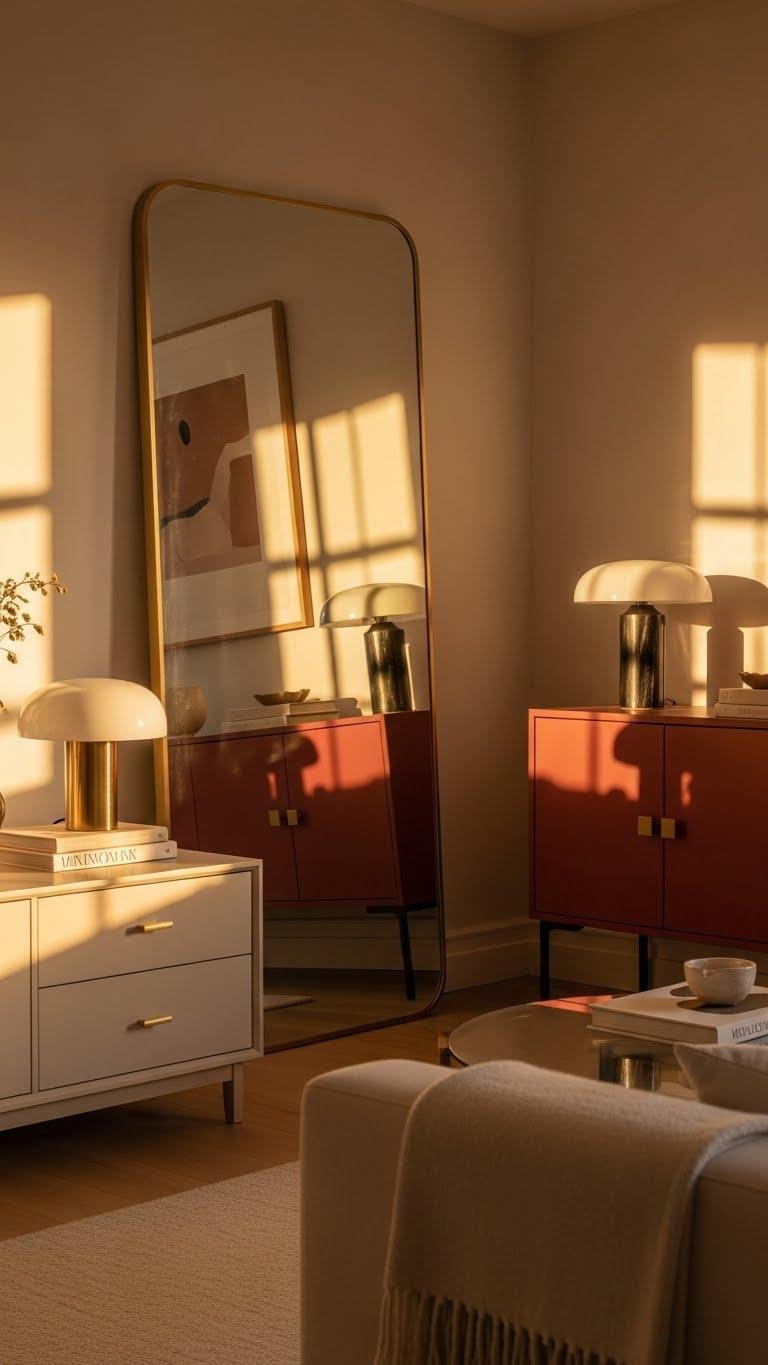 A few well-placed reflective surfaces and polished metals will lift a room’s depth and energy without overpowering your warm, ambient scheme. Use mirrored accents to bounce light and expand sightlines, placing them thoughtfully rather than everywhere.