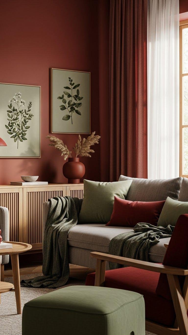 Having anchored the room with deep reds and burgundy for drama, bring in sage green to soften the mood and restore calm.